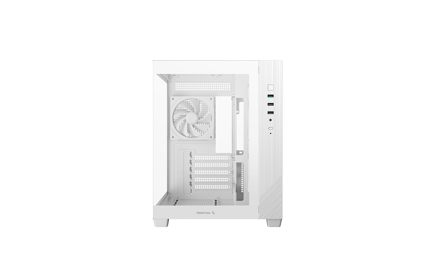 CG330 3F WH jest wyposażona w dwa wentylatory FL z odwrotnymi łopatkami z boku oraz jeden standardowy z tyłu, tworząc poziomy kanał powietrza o wysokiej skuteczności chłodzenia. Unikalny projekt oświetlenia DeepCool zapewnia równomierne podświetlenie całej konstrukcji.