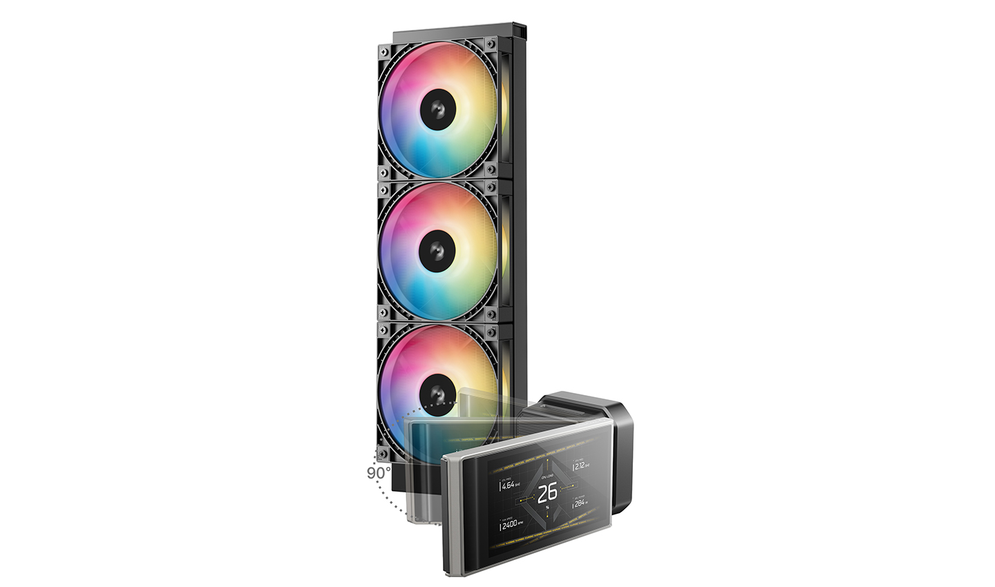Regulowany wyświetlacz zapewnia wyraźną widoczność, nawet gdy chłodnica nie jest skierowana do przodu. Ekran zamontowany na amortyzowanym zawiasie można odchylać pod kątem do 90°, co pozwala ustawić wyświetlacz w pozycji zapewniającej optymalny obraz, nawet gdy obudowa jest ustawiona pod kątem lub oglądana z boku.